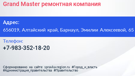 Grand Master, ремонтная компания по адресу 656019, Алтайский край, Барнаул, Эмилии Алексеевой, 65 в дальнейшем Организация, размещена в следующих категориях: