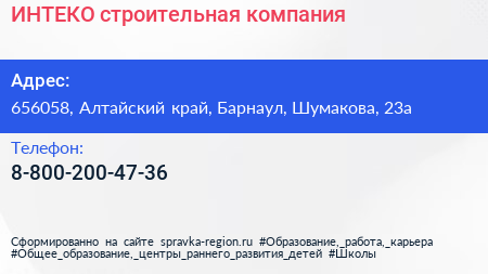 ИНТЕКО, строительная компания по адресу 656058, Алтайский край, Барнаул, Шумакова, 23а в дальнейшем Организация, размещена в следующих категориях: