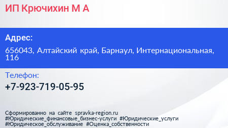 ИП Крючихин М.А. по адресу 656043, Алтайский край, Барнаул, Интернациональная, 116 в дальнейшем Организация, размещена в следующих категориях: