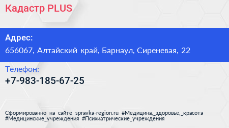 Кадастр PLUS по адресу 656067, Алтайский край, Барнаул, Сиреневая, 22 в дальнейшем Организация, размещена в следующих категориях: