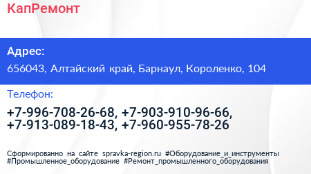 КапРемонт по адресу 656043, Алтайский край, Барнаул, Короленко, 104 в дальнейшем Организация, размещена в следующих категориях: