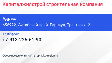 Капиталжилстрой, строительная компания по адресу 656922, Алтайский край, Барнаул, Трактовая, 2л в дальнейшем Организация, размещена в следующих категориях: