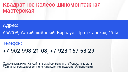 Квадратное колесо, шиномонтажная мастерская по адресу 656008, Алтайский край, Барнаул, Пролетарская, 194а в дальнейшем Организация, размещена в следующих категориях: