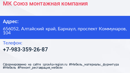 МК Союз, монтажная компания по адресу 656052, Алтайский край, Барнаул, проспект Коммунаров, 104 в дальнейшем Организация, размещена в следующих категориях: