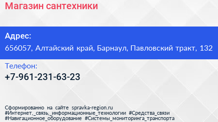 Магазин сантехники по адресу 656057, Алтайский край, Барнаул, Павловский тракт, 132 в дальнейшем Организация, размещена в следующих категориях: