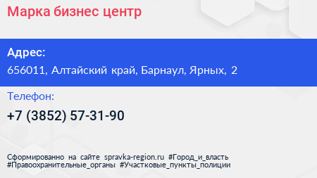 Марка, бизнес-центр по адресу 656011, Алтайский край, Барнаул, Ярных, 2 в дальнейшем Организация, размещена в следующих категориях: