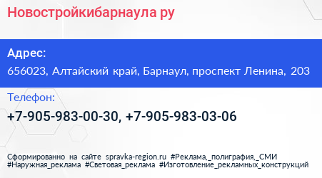 Новостройкибарнаула.ру по адресу 656023, Алтайский край, Барнаул, проспект Ленина, 203 в дальнейшем Организация, размещена в следующих категориях: