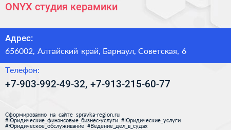 ONYX, студия керамики по адресу 656002, Алтайский край, Барнаул, Советская, 6 в дальнейшем Организация, размещена в следующих категориях: