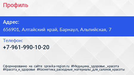 Профиль по адресу 656901, Алтайский край, Барнаул, Альпийская, 7 в дальнейшем Организация, размещена в следующих категориях: