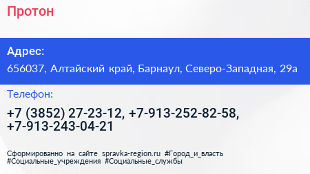 Протон по адресу 656037, Алтайский край, Барнаул, Северо-Западная, 29а в дальнейшем Организация, размещена в следующих категориях: