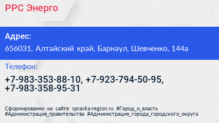 РРС-Энерго по адресу 656031, Алтайский край, Барнаул, Шевченко, 144а в дальнейшем Организация, размещена в следующих категориях: