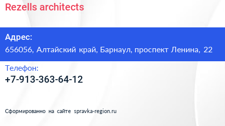 Rezells architects по адресу 656056, Алтайский край, Барнаул, проспект Ленина, 22 в дальнейшем Организация, размещена в следующих категориях: