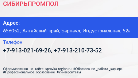 СИБИРЬПРОМПОЛ по адресу 656052, Алтайский край, Барнаул, Индустриальная, 52а в дальнейшем Организация, размещена в следующих категориях: