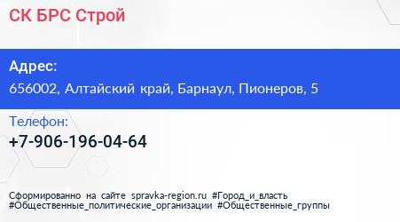 СК БРС-Строй по адресу 656002, Алтайский край, Барнаул, Пионеров, 5 в дальнейшем Организация, размещена в следующих категориях: