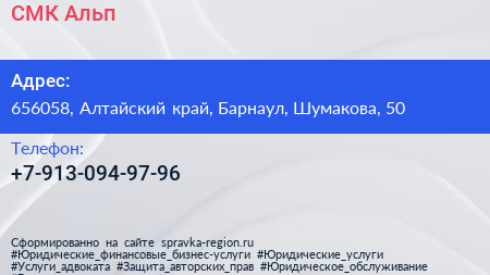 СМК Альп по адресу 656058, Алтайский край, Барнаул, Шумакова, 50 в дальнейшем Организация, размещена в следующих категориях: