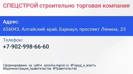 СПЕЦСТРОЙ, строительно-торговая компания по адресу 656043, Алтайский край, Барнаул, проспект Ленина, 23 в дальнейшем Организация, размещена в следующих категориях: