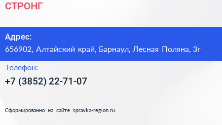 СТРОНГ по адресу 656902, Алтайский край, Барнаул, Лесная Поляна, 3г в дальнейшем Организация, размещена в следующих категориях: