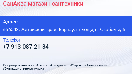 СанАква, магазин сантехники по адресу 656043, Алтайский край, Барнаул, площадь Свободы, 6 в дальнейшем Организация, размещена в следующих категориях: