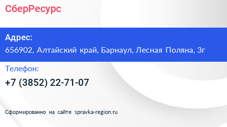 СберРесурс по адресу 656902, Алтайский край, Барнаул, Лесная Поляна, 3г в дальнейшем Организация, размещена в следующих категориях:
