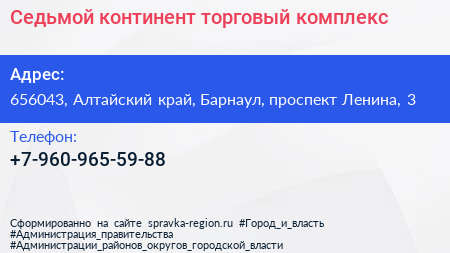 Седьмой континент, торговый комплекс по адресу 656043, Алтайский край, Барнаул, проспект Ленина, 3 в дальнейшем Организация, размещена в следующих категориях: