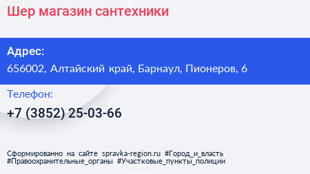 Шер, магазин сантехники по адресу 656002, Алтайский край, Барнаул, Пионеров, 6 в дальнейшем Организация, размещена в следующих категориях: