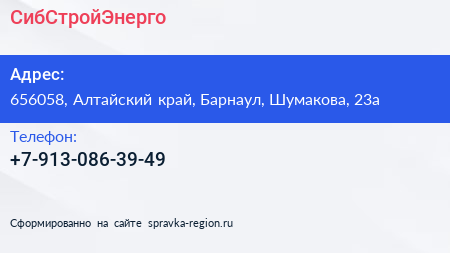СибСтройЭнерго по адресу 656058, Алтайский край, Барнаул, Шумакова, 23а в дальнейшем Организация, размещена в следующих категориях: