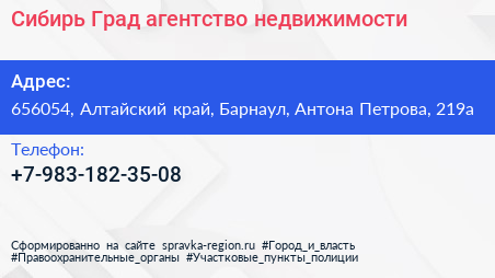 Сибирь-Град, агентство недвижимости по адресу 656054, Алтайский край, Барнаул, Антона Петрова, 219а в дальнейшем Организация, размещена в следующих категориях: