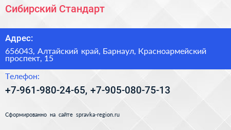 Сибирский Стандарт по адресу 656043, Алтайский край, Барнаул, Красноармейский проспект, 15 в дальнейшем Организация, размещена в следующих категориях: