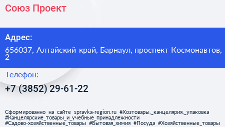 Союз-Проект по адресу 656037, Алтайский край, Барнаул, проспект Космонавтов, 2 в дальнейшем Организация, размещена в следующих категориях: