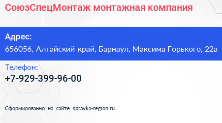 СоюзСпецМонтаж, монтажная компания по адресу 656056, Алтайский край, Барнаул, Максима Горького, 22а в дальнейшем Организация, размещена в следующих категориях: