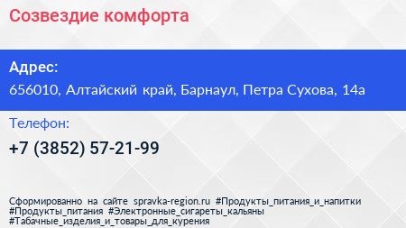 Созвездие комфорта по адресу 656010, Алтайский край, Барнаул, Петра Сухова, 14а в дальнейшем Организация, размещена в следующих категориях: