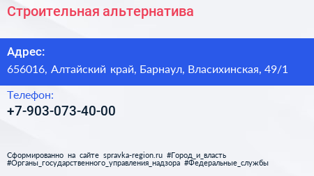 Строительная альтернатива по адресу 656016, Алтайский край, Барнаул, Власихинская, 49/1 в дальнейшем Организация, размещена в следующих категориях: