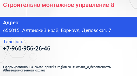 Строительно-монтажное управление-8 по адресу 656015, Алтайский край, Барнаул, Деповская, 7 в дальнейшем Организация, размещена в следующих категориях: