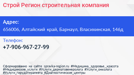 Строй Регион, строительная компания по адресу 656006, Алтайский край, Барнаул, Власихинская, 146д в дальнейшем Организация, размещена в следующих категориях: