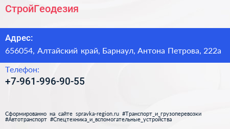 СтройГеодезия по адресу 656054, Алтайский край, Барнаул, Антона Петрова, 222а в дальнейшем Организация, размещена в следующих категориях: