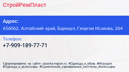 СтройРемПласт по адресу 656062, Алтайский край, Барнаул, Георгия Исакова, 264 в дальнейшем Организация, размещена в следующих категориях:
