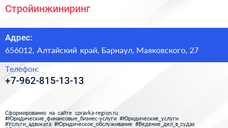 Стройинжиниринг по адресу 656012, Алтайский край, Барнаул, Маяковского, 27 в дальнейшем Организация, размещена в следующих категориях: