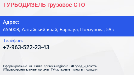 ТУРБОДИЗЕЛЬ, грузовое СТО по адресу 656008, Алтайский край, Барнаул, Ползунова, 59в в дальнейшем Организация, размещена в следующих категориях: