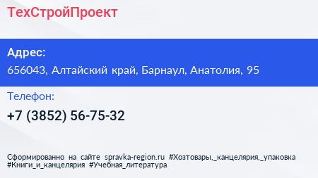 ТехСтройПроект по адресу 656043, Алтайский край, Барнаул, Анатолия, 95 в дальнейшем Организация, размещена в следующих категориях: