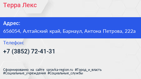 Терра Лекс по адресу 656054, Алтайский край, Барнаул, Антона Петрова, 222а в дальнейшем Организация, размещена в следующих категориях: