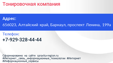 Тонировочная компания по адресу 656023, Алтайский край, Барнаул, проспект Ленина, 199а в дальнейшем Организация, размещена в следующих категориях: