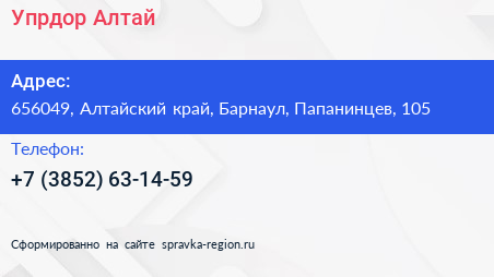 Упрдор Алтай по адресу 656049, Алтайский край, Барнаул, Папанинцев, 105 в дальнейшем Организация, размещена в следующих категориях: