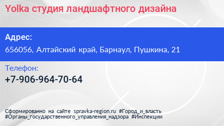 Yolka, студия ландшафтного дизайна по адресу 656056, Алтайский край, Барнаул, Пушкина, 21 в дальнейшем Организация, размещена в следующих категориях: