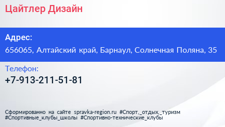 Цайтлер Дизайн по адресу 656065, Алтайский край, Барнаул, Солнечная Поляна, 35 в дальнейшем Организация, размещена в следующих категориях: