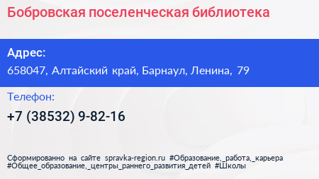 Бобровская поселенческая библиотека по адресу 658047, Алтайский край, Барнаул, Ленина, 79 в дальнейшем Организация, размещена в следующих категориях: