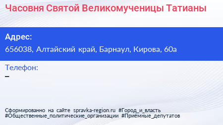 Часовня Святой Великомученицы Татианы по адресу 656038, Алтайский край, Барнаул, Кирова, 60а в дальнейшем Организация, размещена в следующих категориях: