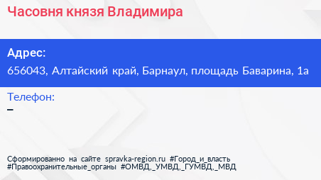 Часовня князя Владимира по адресу 656043, Алтайский край, Барнаул, площадь Баварина, 1а в дальнейшем Организация, размещена в следующих категориях: