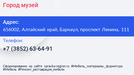 Город, музей по адресу 656002, Алтайский край, Барнаул, проспект Ленина, 111 в дальнейшем Организация, размещена в следующих категориях:
