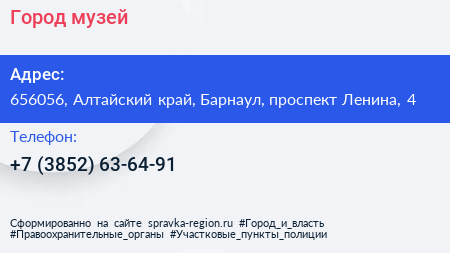 Город, музей по адресу 656056, Алтайский край, Барнаул, проспект Ленина, 4 в дальнейшем Организация, размещена в следующих категориях: