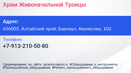 Храм Живоначальной Троицы по адресу 656003, Алтайский край, Барнаул, Аванесова, 102 в дальнейшем Организация, размещена в следующих категориях:
